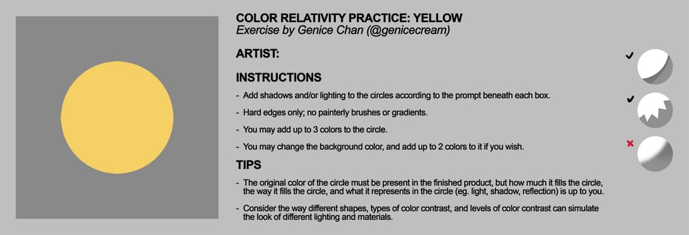 Add shadows and/or lighting to the circles according to the prompts beneath each box.